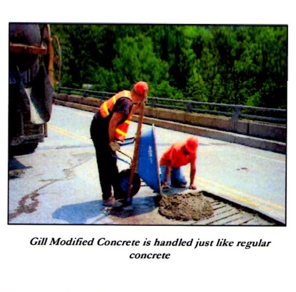 Gill Modified Concrete, is effective in permanently patching and overlaying damaged concrete. Gill Modified Concrete can be used for thin overlays or full depth pours. Concrete made with Gill 33® may be top coated with paint or a protective coating in 24 to 48 hours depending upon mix design and temperature. This concrete also results in high early strength allowing most vehicular traffic four hours after curing. Specific uses for the Gill 33® are intended for bridge and highway surfaces, industrial plant floors, equipment supports, parking garage decks, wastewater treatment plants, chemical and petroleum secondary containment systems and pump bases, and many others. Gill Modified