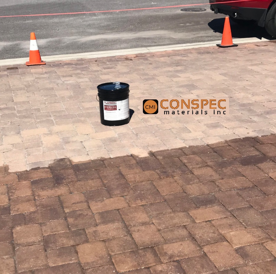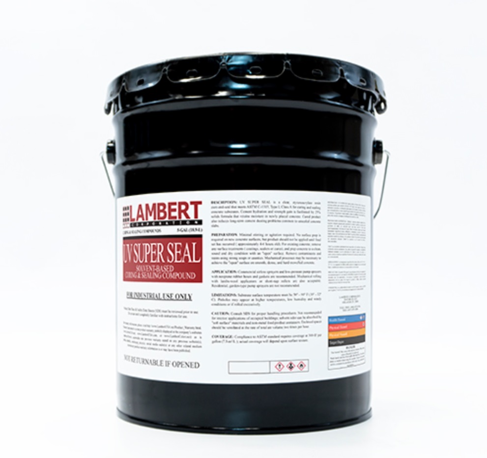 Lambert – UV Super Seal® is a styrene and acrylic resin solvent based product formulated into a high quality concrete sealer, dustproofer and curing compound. It has excellent adhesion to cementitious surfaces both exterior as well as interior and when cured forms a tough impervious film. UV Super Seal® is a thin liquid designed to penetrate into the pores of the concrete filling them with styrene and acrylic resin that gives the concrete surface the maximum protection from wear and penetration of salts, dirt, or other contaminants. UV Super Seal® may also be used as a curing compound when applied to fresh concrete. The film forming qualities of this product minimize moisture vapor transmission resulting in excellent water retention in fresh concrete for better curing and hardening. When used on new concrete it acts as a curing compound for proper cement hydration (one coat only). When used on old concrete it seals and dustproofs the surface (two coats are recommended for most surfaces). The high quality film-forming properties of UV Super Seal® make it an ideal product for use on all types of exterior flooring, pavers, walls, pavements, and parking decks. When spraying use a high solids curing compound sprayer, such as; Hudson 41004-CCV Industrial Sprayer, or Chapin 19049 Xtreme Sprayer. Do not use plastic sprayers!! Do not allow material to puddle, back roll with a solvent resistant roller cover. Do not apply within 48 hours of rain or on wet areas as this will cause white ghosting / hazing known as (efflorescence)