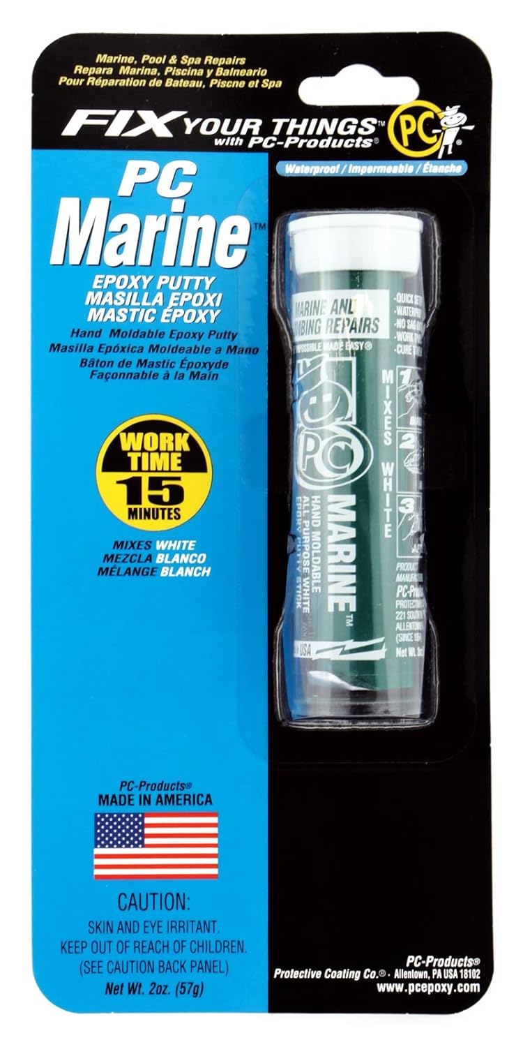 DESCRIPTION: Specially formulated for marine, pool, and plumbing repairs on wet, dry, and underwater surfaces. This repair putty sticks great to metals, fiberglass, tile, wood, and some plastics such as ABS. PC-Marine allows a working time of about 15 minutes and cures for service in 60 minutes. PC-Marine will not bond to wax paper, Teflon, polyethylene, and some other plastics. There are hundreds of uses in thousands of combinations. Use to bond holes in fiberglass, PVC, metal, boats, spas, swimming pools, Stock tanks and more.