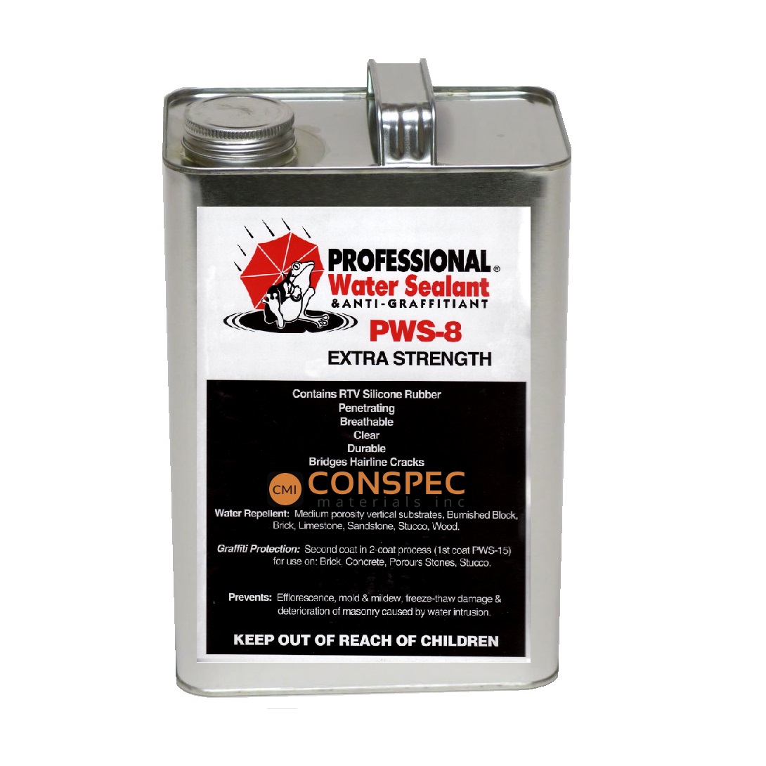 Professional® Water Sealant & Anti-Graffitiant – PWS-8 Water Sealant is ideal for use on concrete, brick, block, precast, pavers, manufactured stone, natural stone, ArcusStone, stucco, limestone, sandstone, cedar wood, and other porous building materials. This clear, penetrating, RTV Silicone sealer is a proprietary blend of inorganic silicone polymers which provide maximum resistance to breakdown from the suns damaging UV light, as well as resistance to acid rain. PWS-8 Watersealants unique silicone technology allows it to remain flexible inside the substrate to allow for bridging of hairline cracks and protect against building freeze-thaw cycles. Once installed it remains breathable to allow moisture vapor to escape while preventing outside water penetration. Simple 1-coat application, 10-Year warranties available. Optional 2-coat system for anti-graffiti requires use of PWS-15. Meets ASTM E-514 Water Repellency and 98-mph Wind Driven Rain Conditions. Rated Best Historic Brick Sealer on the Market!