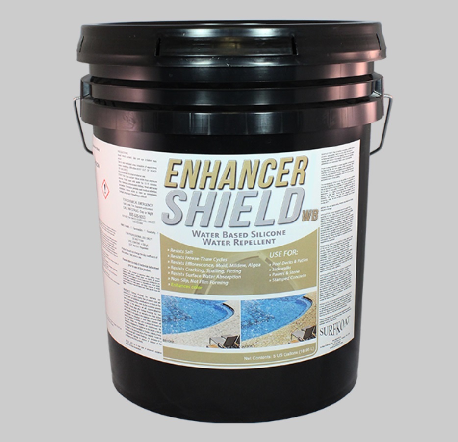 ENHANCER SHIELD WB is an active Water-based deep penetrating silicone water repellent and impregnating agent for porous masonry surfaces such as concrete, block, brick, concrete, paver, and unglazed tile. CLEAR application that enhances colored and stained concrete, decorative stones, pavers and cementitious overlays with no film build! ENHANCER SHIELD SB penetrates and chemically bonds deep within the substrate to provide long lasting protection against deterioration or staining due to water conditions.